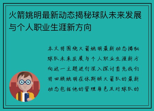 本文将围绕姚明在篮球场上的速度及其与其他篮球巨星的对比进行深入分析。首先,我们会探讨姚明独特的身体素质和运动能力,使其在比赛中展现出不俗的速度。接着,文章将比较姚明与其他篮球巨星如迈克尔·乔丹、科比·布莱恩特以及勒布朗·詹姆斯等选手在速度方面的表现。此外,我们还会讨论影响球员速度的因素,包括训练、技术和心理状态等方面。最后,结合这些对比分析,总结出谁能真正与姚明在速度上相匹敌。通过这篇文章,希望能...